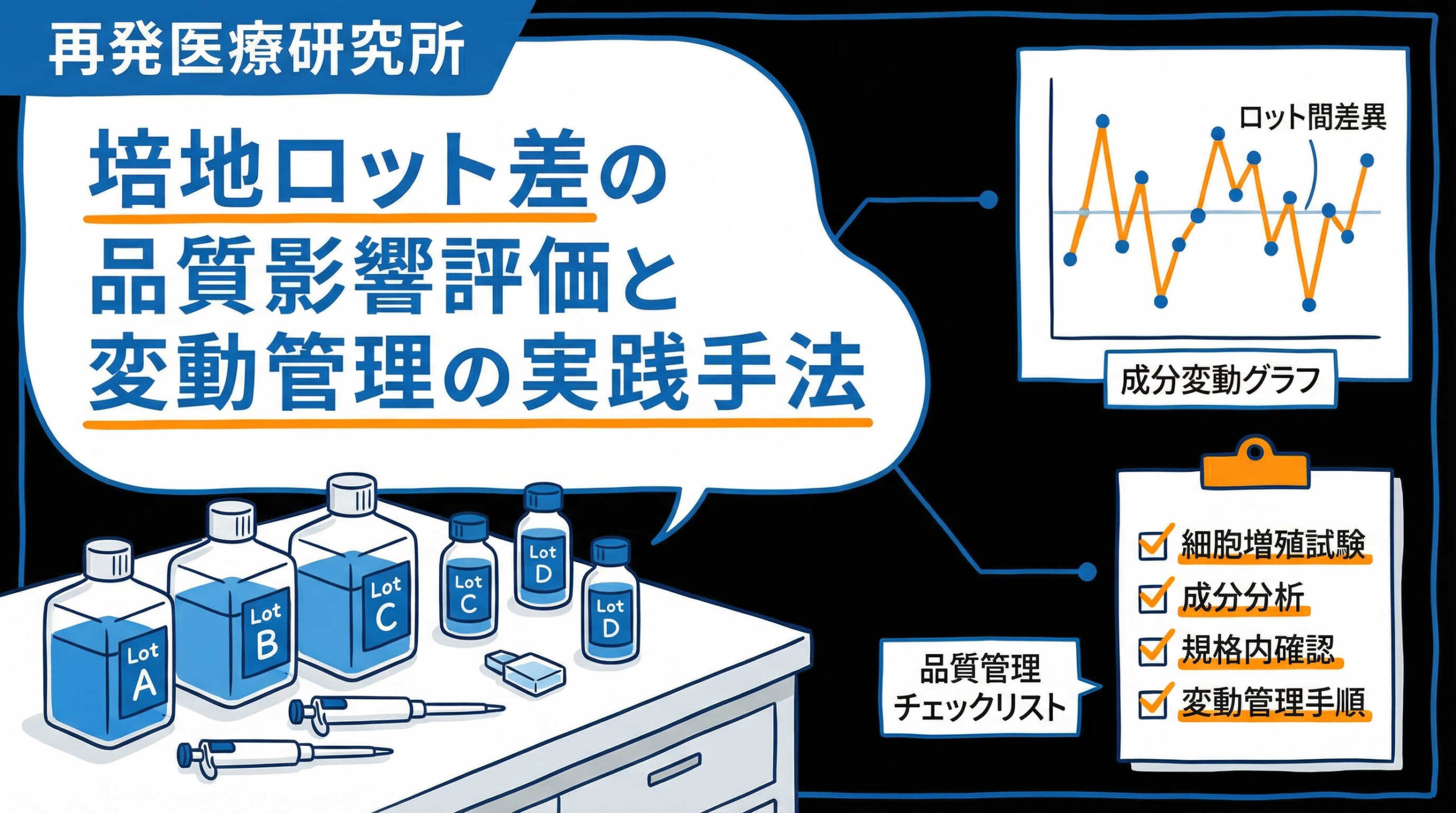 製品の恒常性を維持し、GCTP/GMP省令に準拠した製造プロセスを確立するためには、培地のロット間変動を科学的に評価し、許容範囲内であることを証明する「品質影響評価」が不可欠です。